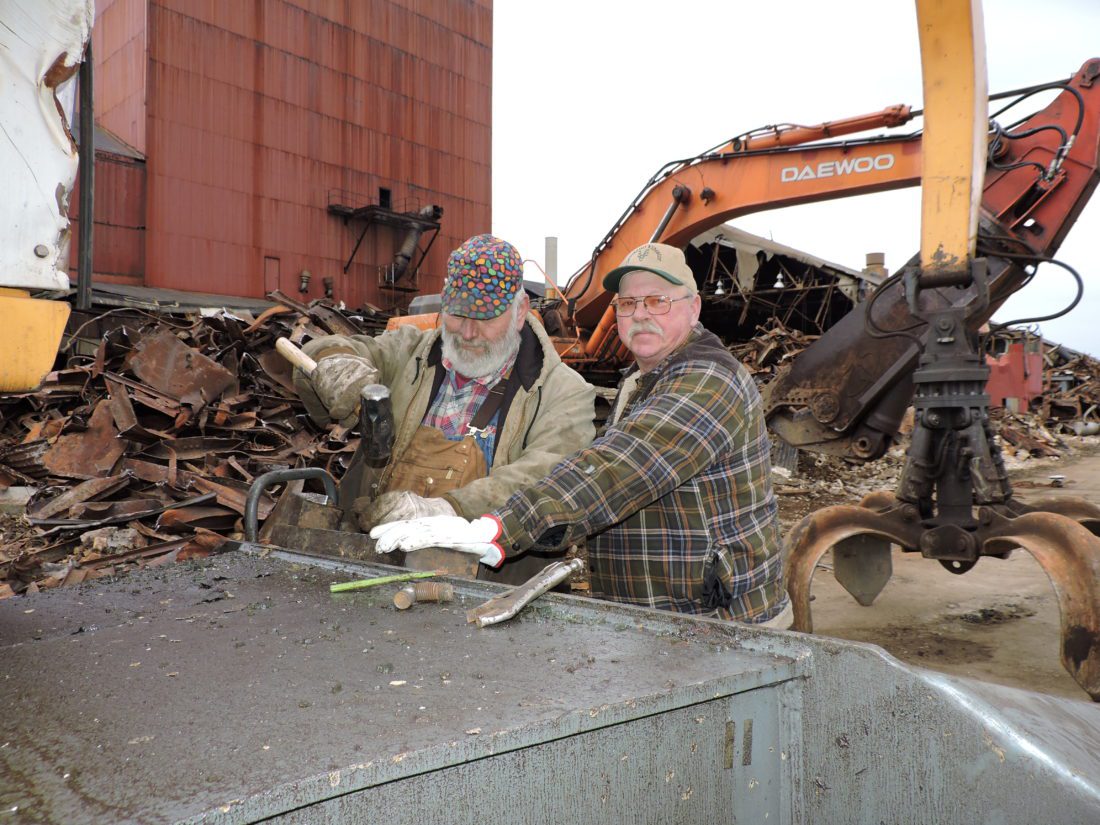 MIKE LEE, left, and Delbert Nichols, both employees of Columbus Auto Shredding of Columbus, Ohio, work to repair a blade from a cutting machine at the site of the former RG Steel plant in Martins Ferry on Monday. The company is razing a section of the former steel mill for its owner, Mull Group Inc. of Wheeling.