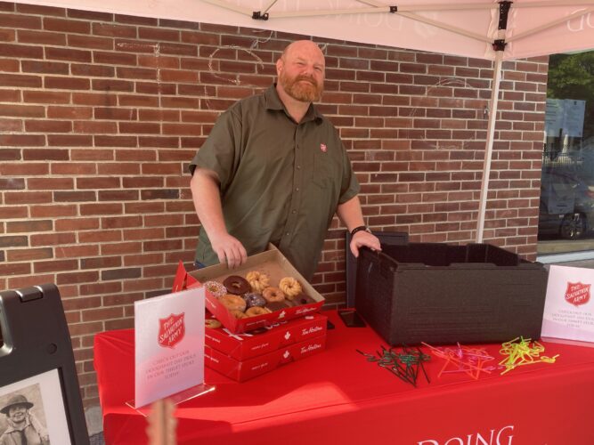Nathan Blake, the community relations director for The Salvation Army in Wheeling, passes out free doughnuts in honor of “National Doughnut Day” in front of the organization’s 16th Street facility. Salvation Army “Doughnut Girls” prepared doughnuts for soldiers ...