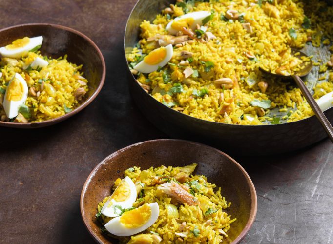 Freshly cooked rice often results in a soggy, gluey dish because it continues to cook as ingredients are added to the pan. But chilling previously cooked rice changes its starches, yielding light, separate grains.