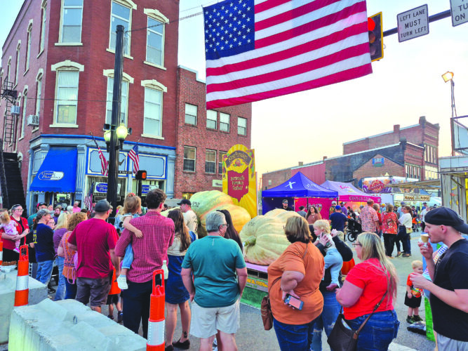 Families wait in line to take photos with the King Pumpkin at the corner of Main and Chestnut streets on Friday evening. The 1,952-pound champion was raised by Bill Neptune of New Concord, Ohio. The Barnesville Pumpkin Festival continues throughout the ...