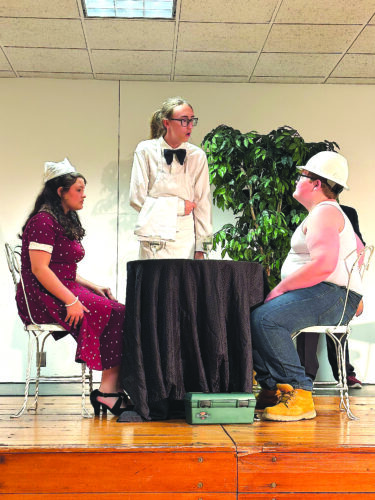Maelynn Rumskey, Dane Smith and Zayne Polivka rehearse a scene from Bellaire High School’s Evening of Comedy One Acts, which will be held at the Bellaire Public Library at 7 p.m. Thursday and Friday. There is an entry fee.