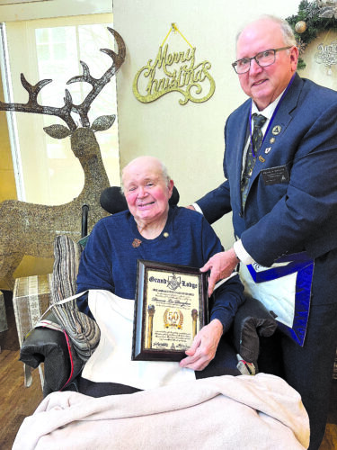 Photo Provided Dennis L. Douglass received his 50-year pin and certificate from Flushing Masonic Lodge #298. Frank D. Ballog, Past District Deputy from Flushing Lodge, traveled to Canal Winchester to present Douglass his award. Fifty-year members are recognized by the Grand Lodge of Free ...