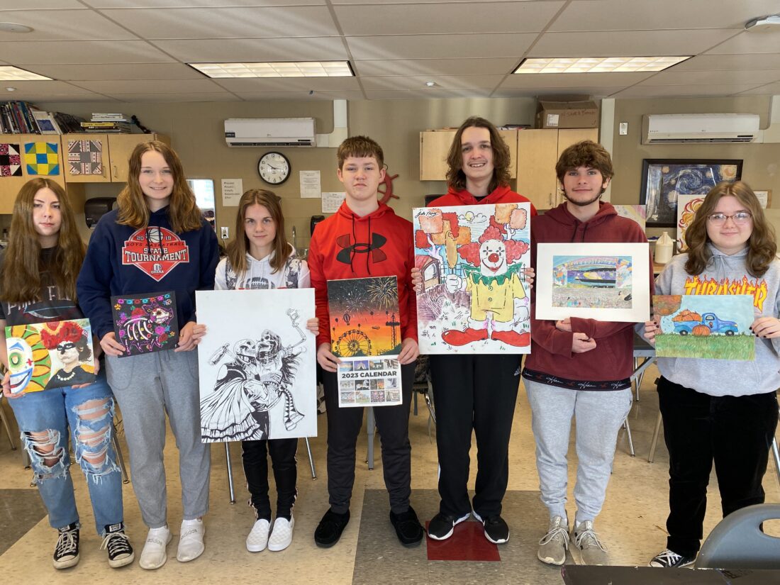 River High School art students, from left, Madison Alderman, Karson Pfalzgraf, Mara Beard, Gavin Todd, Jake Henry, Hunter Horton and Haylee Deitch pose after taking part in the annual calendar contest sponsored by The Marietta Times newspaper, a sister publication of The Times Leader. This year’s theme was “Fairs and Festivals.” The newspaper received entries from high schools in its six-county service area. Todd’s “4th of July” painting is featured for the month of July. Deitch’s painting “Pumpkin Patch Truck” is featured for the month of October. Pfalzgraf’s drawing of “Day of the Dead” is featured for the month of November. Alderman painted “Masked Female on Day of the Dead.” Beard used black fine point marker to create her “Day of the Dead Celebration.” Horton used colored pencils to create his drawing of “Woodstock.” All seven entries from River HS were featured in this year’s calendar, which is a promotion of the Newspapers In Education program.