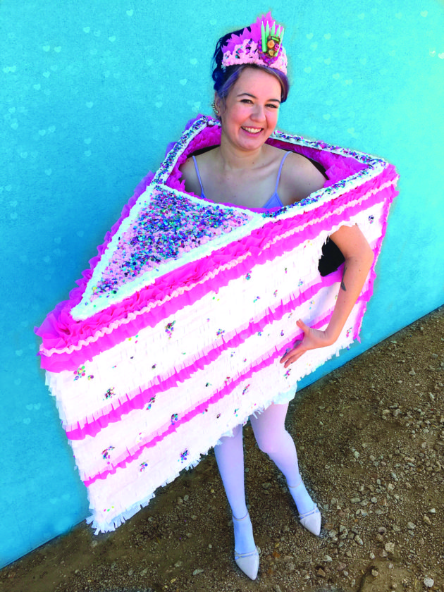 Cut white party streamers into 16-inch strips. Fold and fringe with scissors. Set cake on its side and add line of white glue along bottom edge. Attach one strip of paper fringe at a time, repeating to cover entire box. Use colored streamers to add “frosting layers.” Continue until entire cake is covered. Add extra ruffles up sides of cake to look like frosting, and use varnish to add confetti to sides of cake. Cut cardboard triangle and decorate with clay and confetti. Let dry and glue in place on top of cake. Add more clay “icing” around edges.