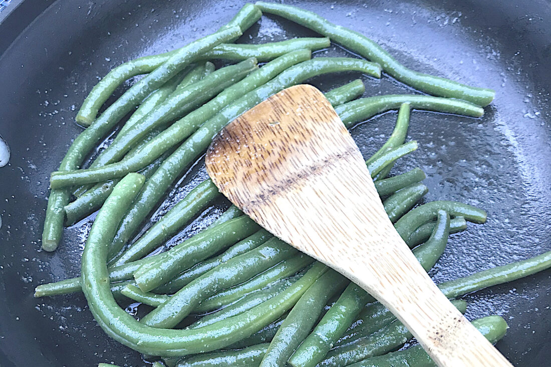 A plate of green beans picked from a home garden is prepared in a saute pan in Chatham, Mass. on July 28, 2021. Nutrition experts say you can improve your health anywhere by mimicking at least one aspect of the diet — eat whatever fruits and vegetables are in season. (AP Photo/Carolyn Lessard)
