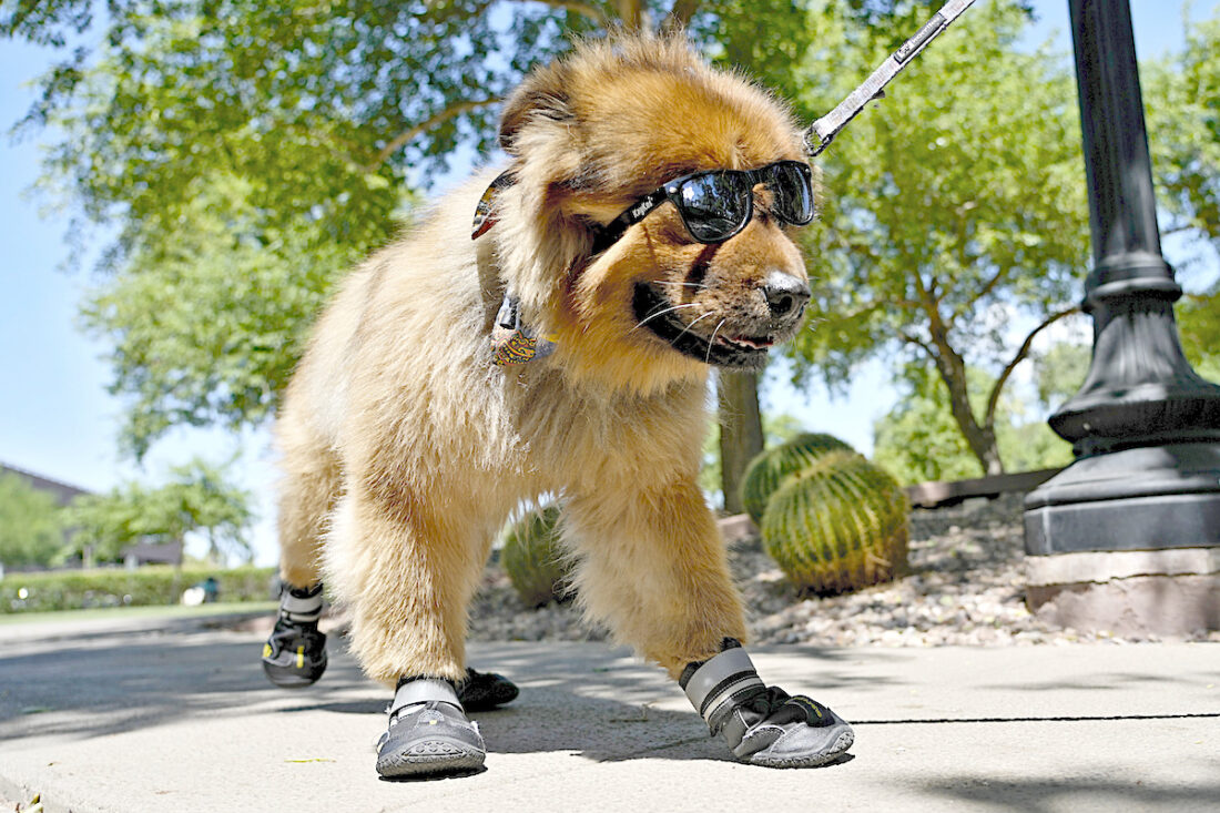 "Teddy" a 7-year-old chow mix, wears his sunglasses and paw booties on a walk at a park, Monday, July 15, 2024, in Phoenix. As sweltering temperatures drag on around the U.S., it's not just people who need help with the dog days of summer. Pet owners have to consider how to both shield and cool down furry family members as intense — and at times deadly — heat waves become more common occurrences. (AP Photo/Matt York)