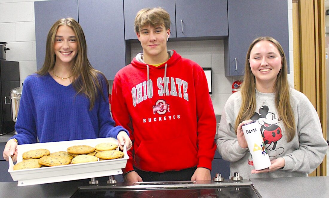 Photo Provided Buckeye Local High School students in Luke Fabry’s Foods 2 class are raising money to return to Disney World Epcot in Orlando, Fla., this April for the annual Cook Around the World Competition. Sixteen students are planning to attend after last year’s team scored an impressive fourth-place nod with one of its dishes. Cookies, personalized cups and other items are being sold to raise funds and a soup benefit is being eyed for January. Pictured with some of the items are, from left, Allie Emfield, Brennin Takach and Sydney Snyder.