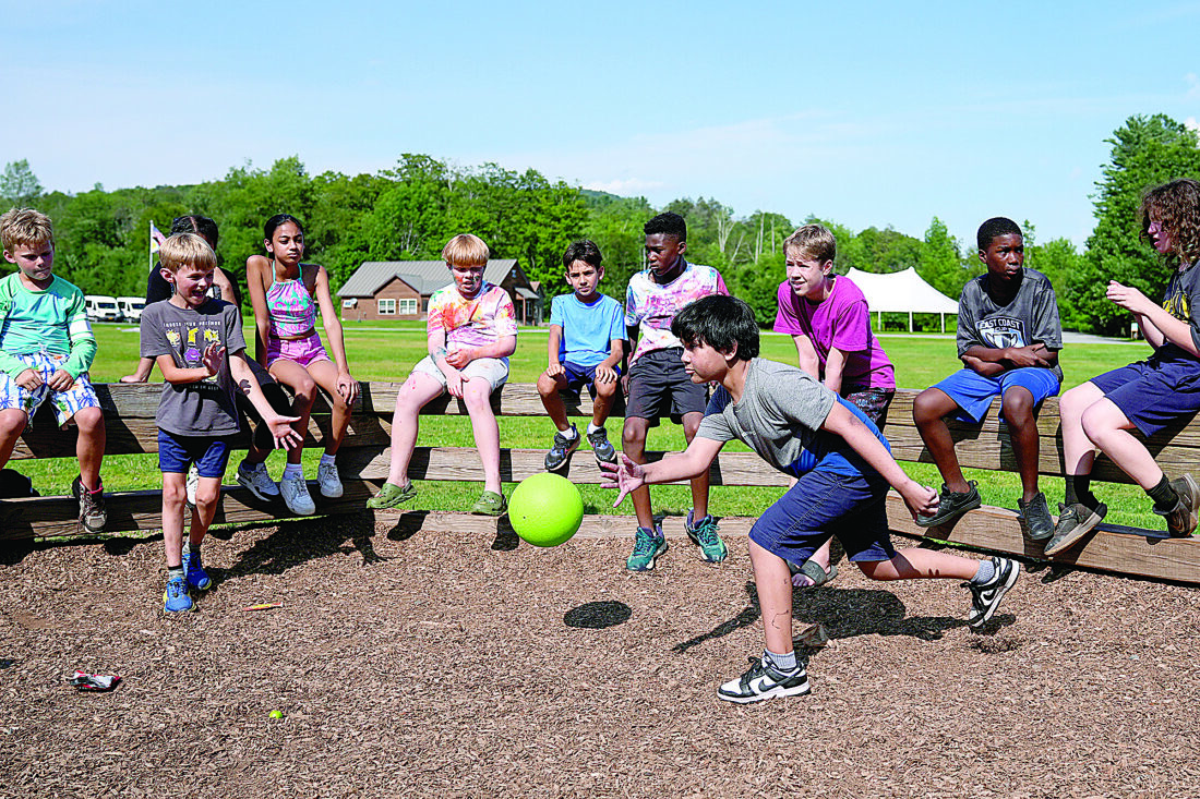 Dylan Aristy Mota, 12, of New York City, who has lupus, plays a game of Gaga Ball with fellow campers at the Frost Valley YMCA sleepaway camp in Claryville, N.Y., Wednesday, July 30, 2025. The camp partnered with Children's Hospital at Montefiore so kids with autoimmune diseases could attend for the first time. (AP Photo/Matt Rourke)