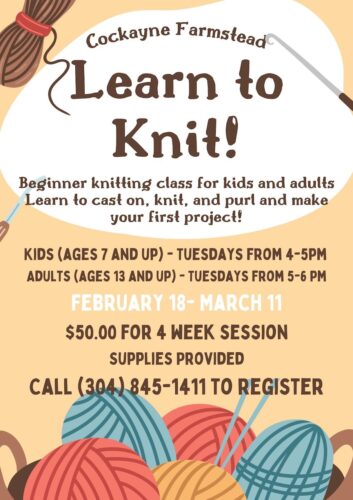 GLEN DALE — If January is getting you down and you’d like to learn a new skill, check out three knitting classes being offered at Cockayne Farmstead in February.