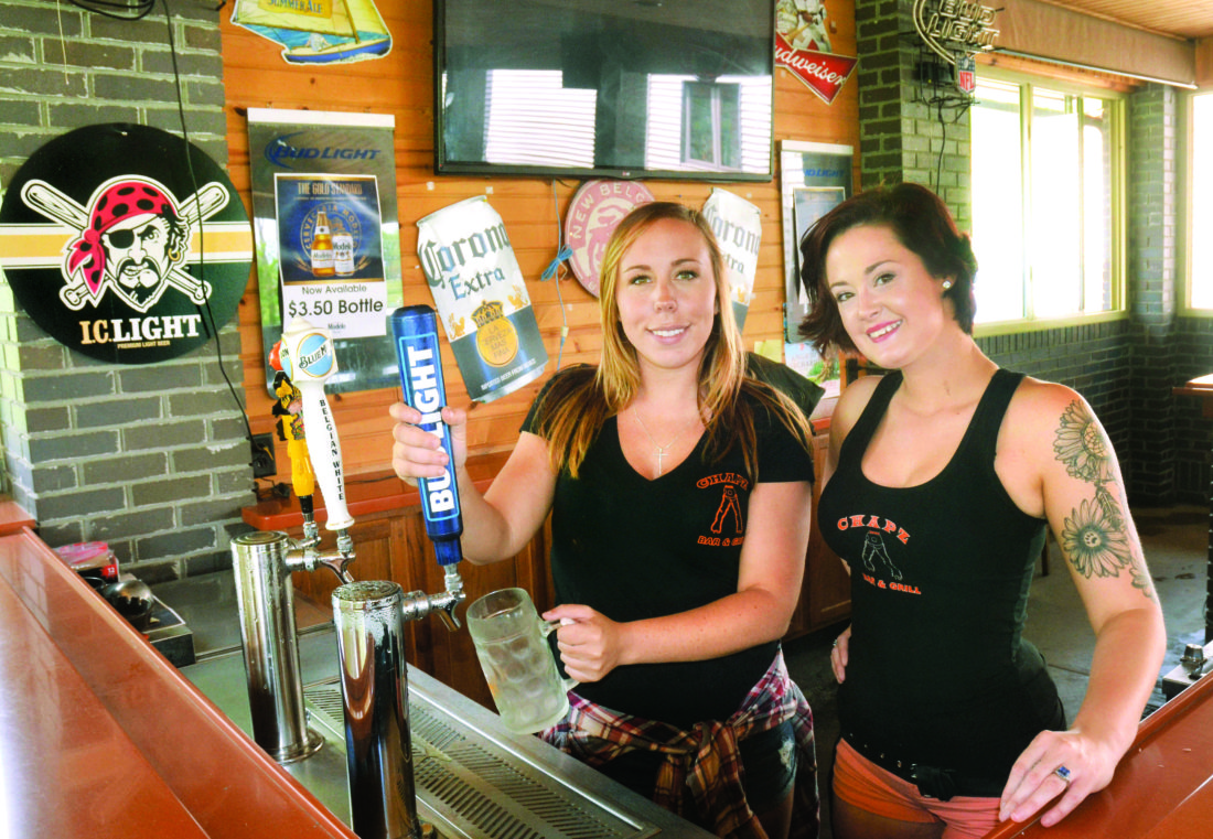Photo by Scott McCloskey Chapz Employees Carlee Stiles, left, and Kristin Wood feature the outdoor bar a patio area at Chapz Restaurant near Morristown.