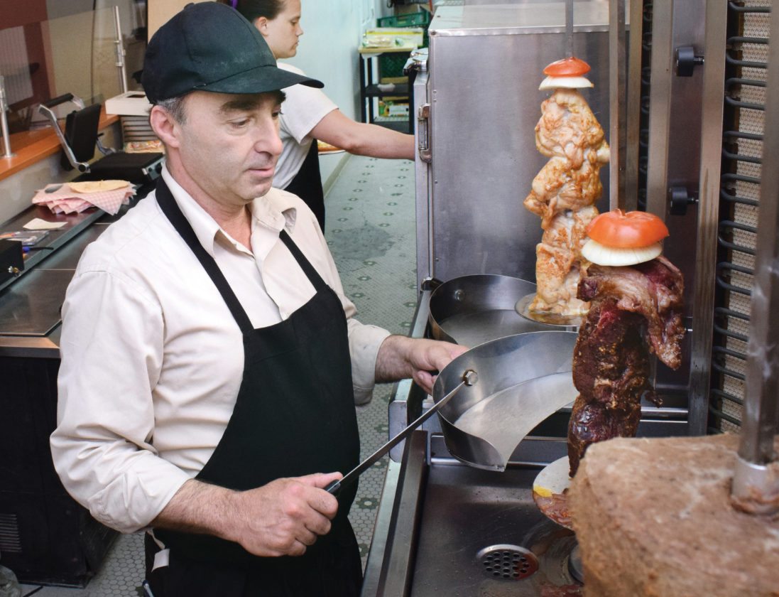 Photo by Scott McCloskey Owner Mark Jaber shaves steak to make a gyro for a customer.