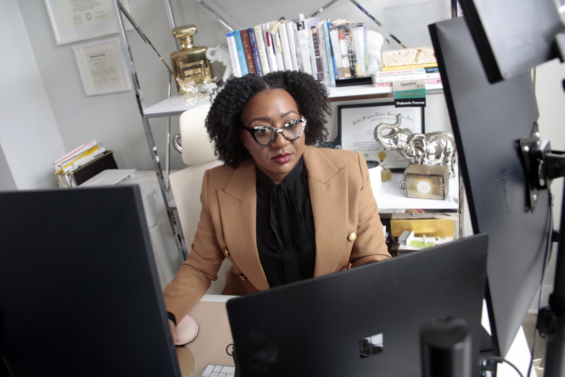 Chantel Adams, a senior marketing executive, sits in her home office Thursday, March 7, 2024, in Durham, N.C. Adams says she isn’t surprised that the gender pay gap persists even among men and women with the same level and quality of education, or that the gap is wider for Black and Hispanic women. (AP Photo/Chris Seward)