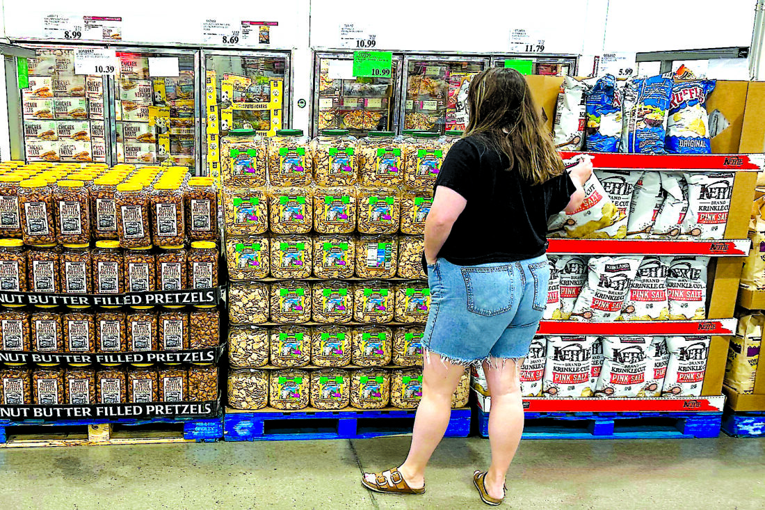 A shopper considers a purchase in a Costco warehouse Thursday, Aug. 22, 2024, in Parker, Colo. (AP Photo/David Zalubowski)