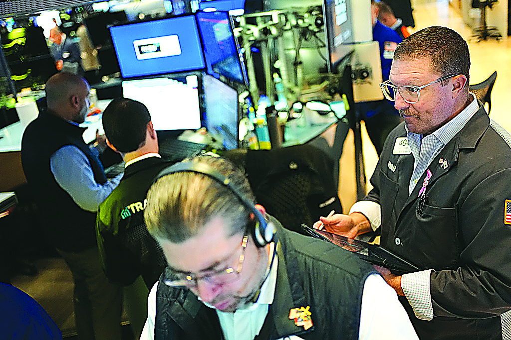 Ryan Falvey, right, works on the floor at the New York Stock Exchange in New York, Wednesday, Oct. 29, 2025. (AP Photo/Seth Wenig)