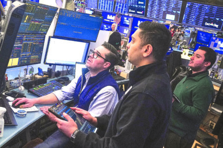 Traders Joseph Lawler, left, and Niall Pawa, center, and Drew Cohen work on the floor of the New York Stock Exchange, Thursday, Feb. 19, 2026. (AP Photo/Richard Drew)