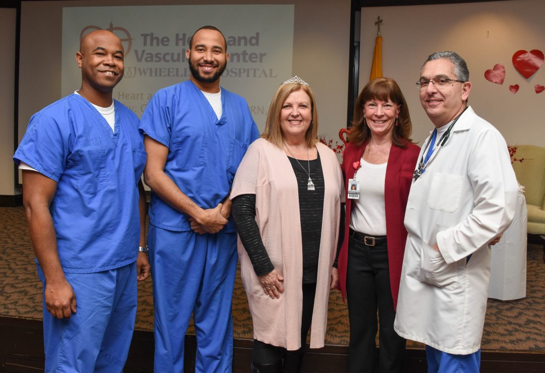 Nancy Morris of Martins Ferry shows off her crown after being named “Queen of Hearts” at Wheeling Hospital’s third annual Heart and Soul celebration. The free event, sponsored by the hospital’s Chest Pain Center and Community Education and Outreach Department, is open to area women who have survived heart, heart valve or vascular disease. Nearly 125 attendees gathered to listen to guest speakers and enjoy food, refreshments, basket raffles and door prizes. Shown with Morris are, from left: interventional cardiologists Dr. Triston Smith and Dr. Gregory Suero; Susie Fullerton, R.N., Chest Pain Center coordinator; and interventional cardiologist Dr. Adel Frenn.