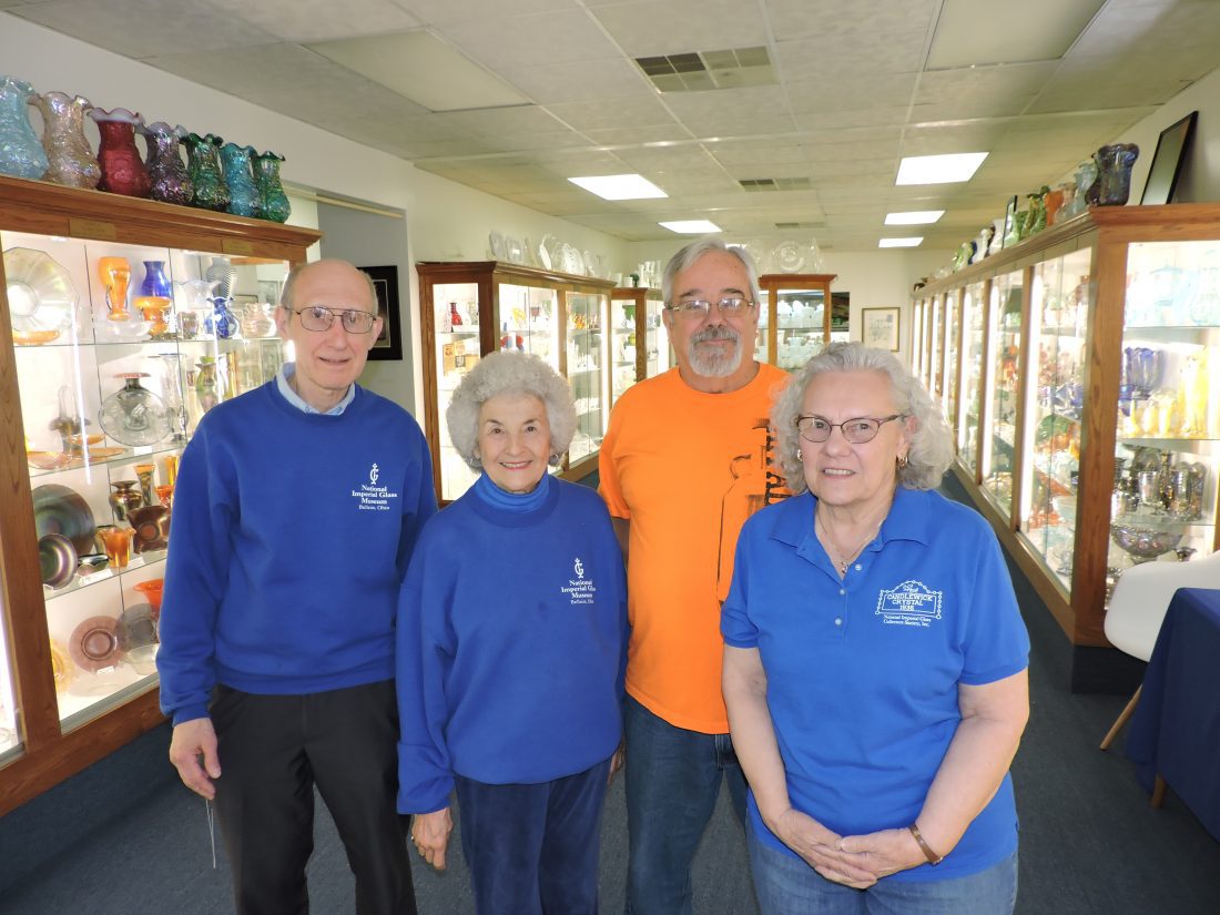 T-L Photo/SHELLEY HANSON NATIONAL IMPERIAL Glass Museum volunteers, from left, Fred Ottoson, Rosalie Wenckoski, Steve Fabry and Mary Blacker pose inside the museum now open for the season in Bellaire.