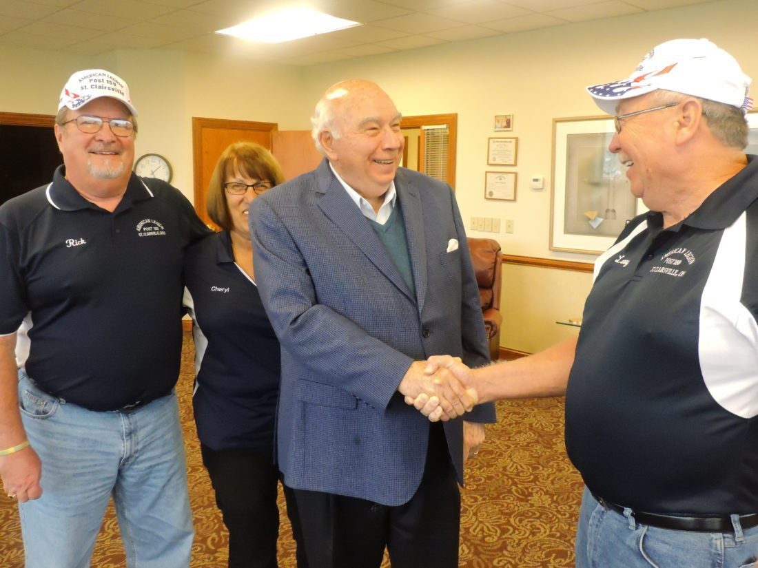 File Photo St. Clairsville American Legion Post 159 Commander Larry Barnes, right, shakes hands with Robert E. Murray of Murray Energy in 2017, thanking him for a $10,000 donation toward a new metal roof for the legion post’s building. Looking on are Rick Rogers and Cheryl Barnes.