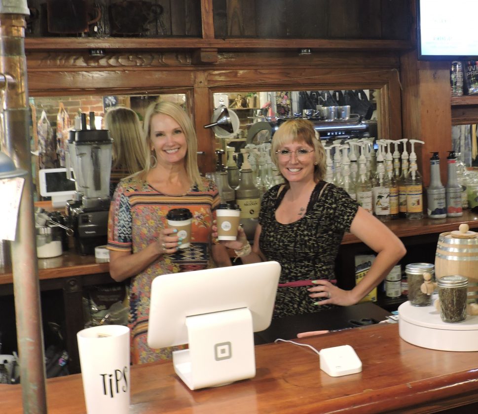T-L Photo/CARRI GRAHAM Three Labs Salvage owner Lynn Jeffries, left, cheers a cup of coffee with Flatiron Coffee owner Nicole Simmons.