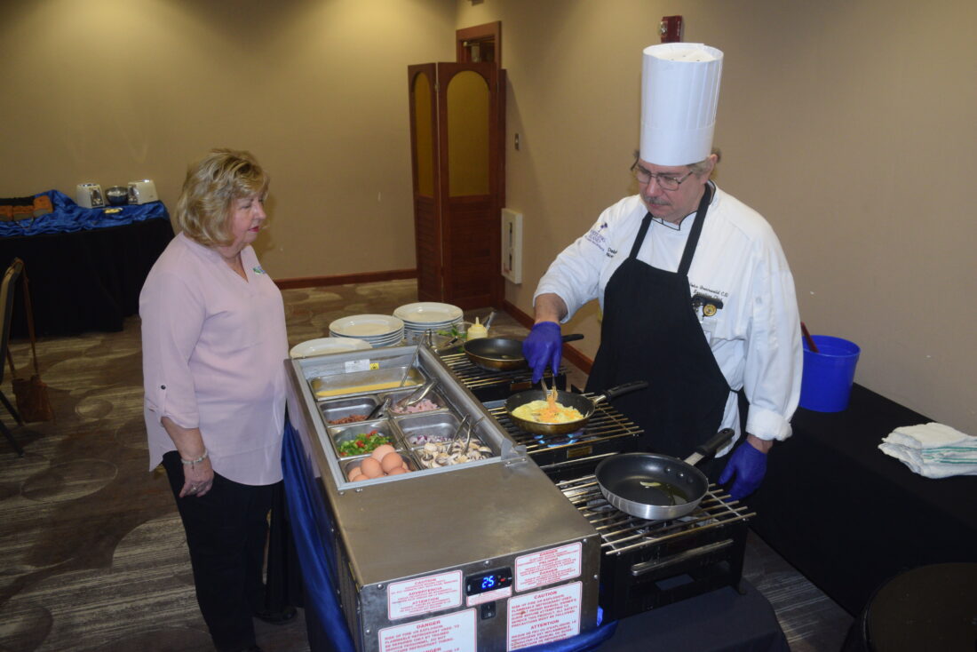 Photo by Derek Redd Wheeling Health Right Assistant Director Dee Phillips waits for an omelette from Chef John Greenwald, executive chef of the Wheeling Island Hotel-Casino-Racetrack. The hotel-casino-racetrack will be one of the participating restaurants in the 2023 Chef’s Auction, which benefits Wheeling Health Right.