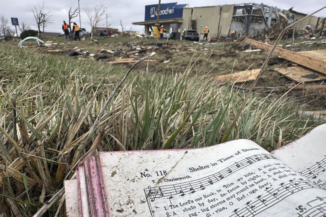 A hymnal book from a destroyed church across the street is seen among the debris strewn in Winchester, Ind., on Friday, March 15, 2024, after storms ripped through the area Thursday night. (AP Photo/Isabella Volmert)
