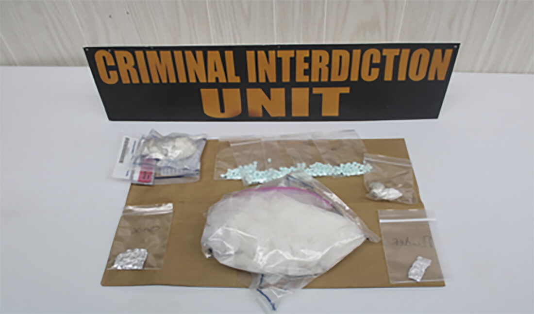 Evidence is displayed in a case in which large amounts of illegal drugs were seized in Bellaire Friday. Christopher Franklin, 32, of Canton, Ohio, was arrested along with James Kempf, 55, of Bellaire and Monique Green, 50, of Bellaire. The arrests were made by the Belmont County Sheriff’s Criminal Interdiction Unit with assistance of the Bellaire Police Department. The suspects allegedly were in possession of over 300 grams of methamphetamine, more than an ounce of crack cocaine and over 1 ounce of powder and pressed fentanyl. All three suspects were lodged in the Belmont County Jail, charged with first-degree felony possession of and trafficking in cocaine and fentanyl. If convicted, they would be considered to be “Major Drug Offenders” under Ohio law, the sheriff’s department notes in a release.
