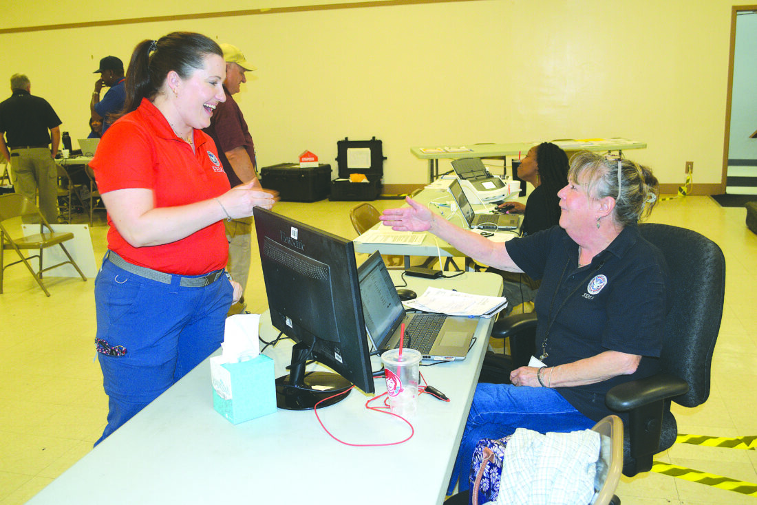 Photo by Derek Redd FEMA Federal Coordinating Officer Abby Eichorn, left, talks with Emergency Management Specialist Susan Wilderson on Friday at the Ohio County Disaster Recovery Center at the Triadelphia Community Center.