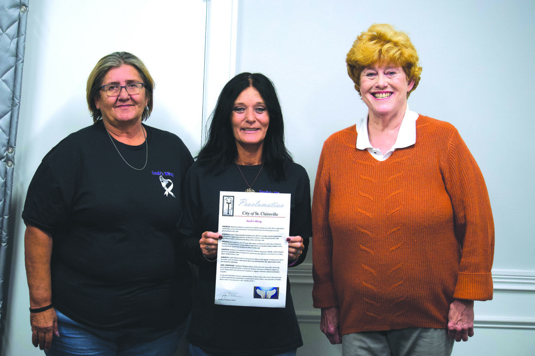 T-L Photos/GAGE VOTA Leah’s Wing volunteer Betzi Kemp, on left, Leah’s Wing founder Sheila Abbott, and St. Clairsville Mayor Kathryn Thalman honor domestic violence victims with Thalman’s proclamation declaring October to be Domestic Violence Awareness Month.