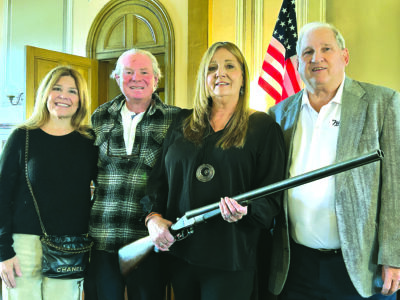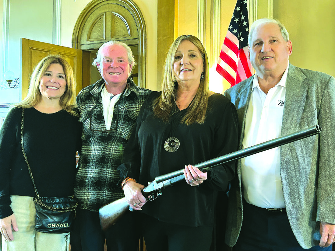 Photo by Joselyn King Pittsburgh-based engineer and businessman Curtis Kossman, second from left, presents a gun made by the Hollenbeck Gun Co. of Wheeling in the 1880s to Debbie Jones, site director for West Virginia Independence Hall. Kossman donated the gun to West Virginia Independence Hall on Thursday. Pictured from left are Kossman’s wife, Justine Kossman; Kossman; Jones; and Wheeling Mayor Denny Magruder.