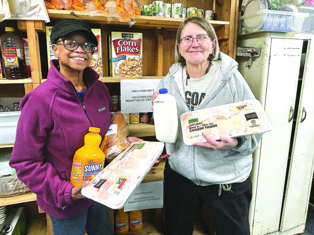 Photo by Joselyn King Volunteers Dee King, left, and Andrea Duska help ready food items at the Bethlehem Apostolic Temple for distribution on Saturday in time for next week’s Thanksgiving dinner.
