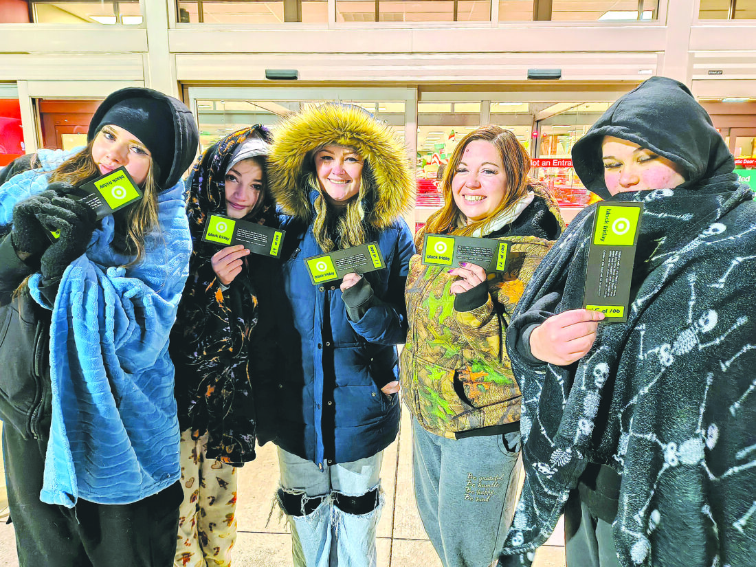 Photo by Shelley Hanson Friends Aubrey Taylor of McMechen, Lily Och of Bethlehem, Leah Johnson of Yorkville, Kayla Wise of McMechen and Jewel Garrison of Bethlehem wait to get into Target on Friday morning. The group and many others received tickets to receive “swag bags” once inside the store that opened at 6 a.m.