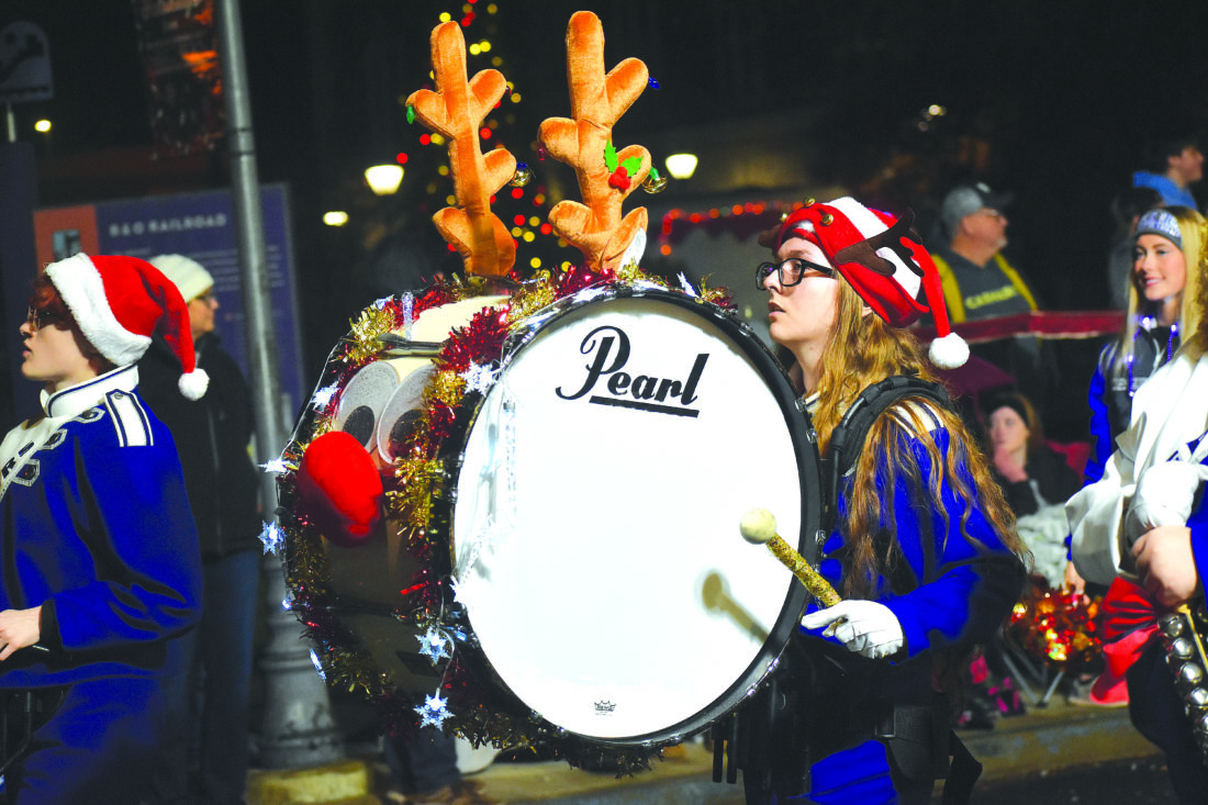 Photo by Eric Ayres Members of the Martins Ferry High School Marching Band perform holiday numbers during Friday’s Christmas parade in downtown Wheeling.