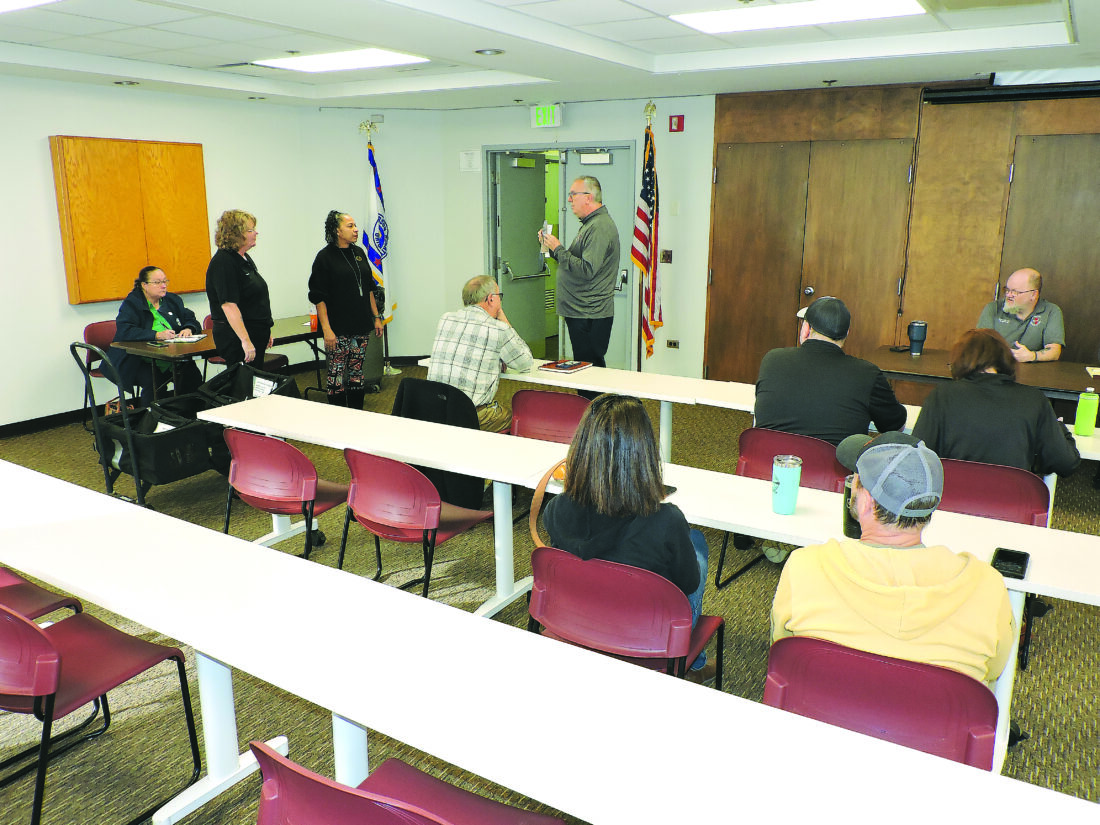 Under questioning by Bob Gale, director of the Jefferson County Board of Elections, county election clerks Traci Corder, left, and Dawn Freeman confirmed ballots delivered to the board’s office on election night arrived sealed as county election officials prepared on Monday to recount those cast in a close Wintersville Council race involving incumbent Jason Mattern and challenger Rich Gunther. Photo by Warren Scott