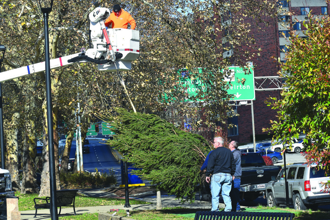 On Monday, city crews installed the Christmas tree at The Plaza on Market, where Santa Claus will light the tree Wednesday night during Winter on the Plaza and kick off the holidays. The 14-foot-tall Norway spruce was donated by Duplaga’s Top Notch Landscaping of Wheeling. It will serve as the centerpiece of the city’s holiday celebrations this year, officials said.