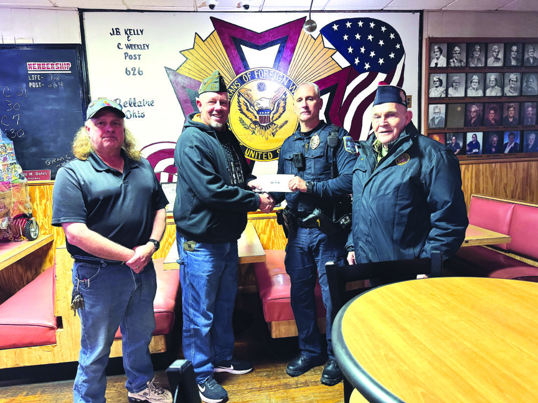Photo Provided The Bellaire VFW Post 626 Veterans Charity Fund, supports public safety through a $1,000 donation to defray costs of the Bellaire Police Department firearms qualification and safety training. Pictures from left are VFW member John McCloud; Post Commander Eric Slater; Bellaire Police Chief J. J. Watson; and Senior Vice-Commander Bob Blount.