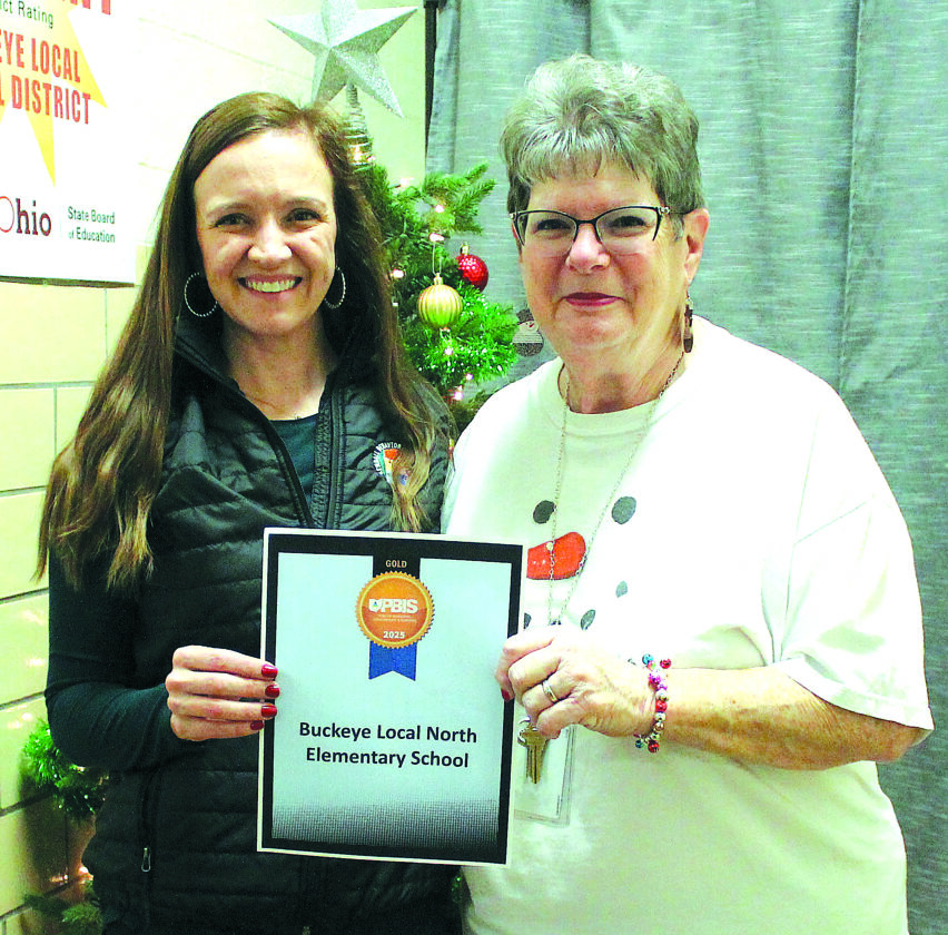 Photo Provided Buckeye North Elementary received a gold award for its Positive Behavioral Interventions and Supports (PBIS) program from the Ohio Department of Education and Workforce, which was given to less than 1 percent of the state. Pictured are Board-Certified Behavior Analyst Kristen Robinson of Kendall Behavioral Solutions who worked with the school, and North Elementary Principal Susan Nolan.
