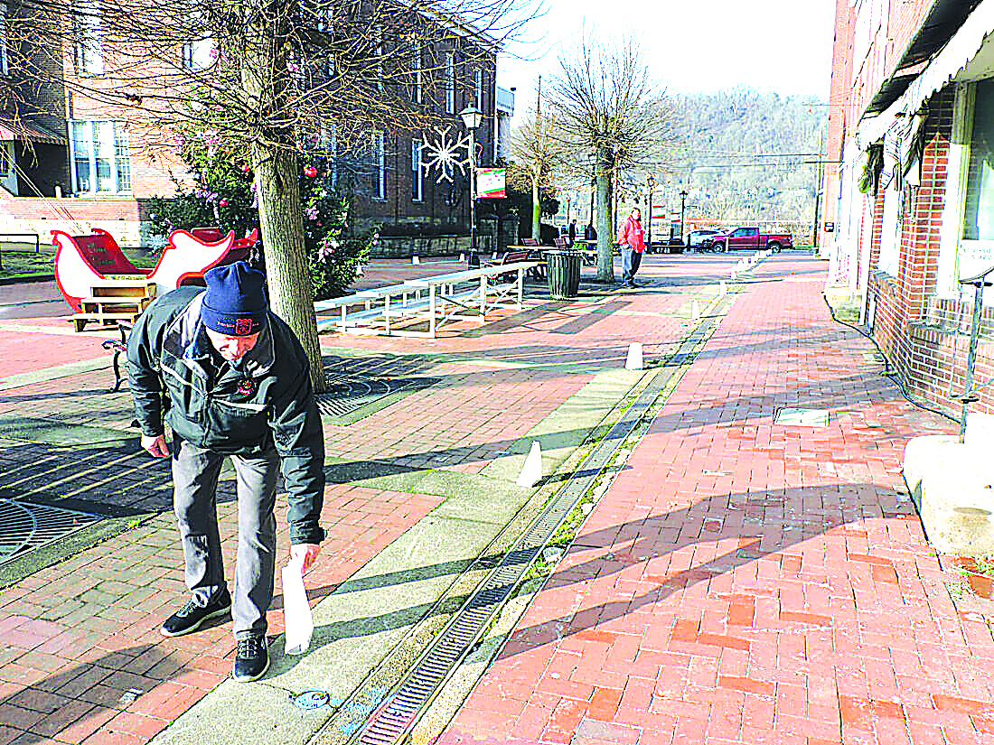 Photo by Warren Scott Terry Stuck and other members of the Franklin Community and Wellsburg fire departments and other volunteers placed more than 1,000 luminaria along the Wellsburg Town Square and Commerce Street (state Route 2) and outside local churches on Wednesday morning, returning at dusk to light them. It’s a Christmas tradition the firefighters have carried on in memory of Ron Ostrosky, a firefighter who had organized the luminaria as a member of the Wellsburg Kiwanis Club.
