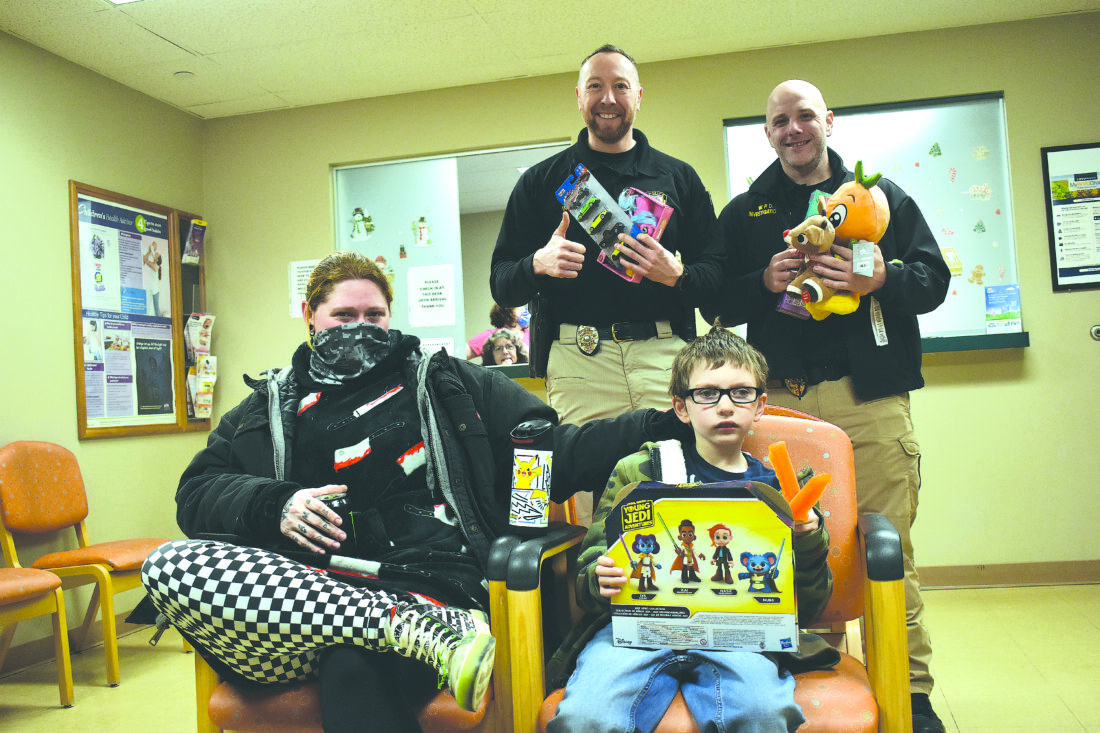 Photo by Eric Ayres Deputy Chief Josh Sanders and Det. Brandon Hoen of the Wheeling Police Department, in back from left, helped deliver toys Wednesday at WVU Medicine Wheeling Hospital. Among the recipients was 9-year-old Jeremy Richards, seated at right, accompanied by Chloe Mercer of Glencoe.
