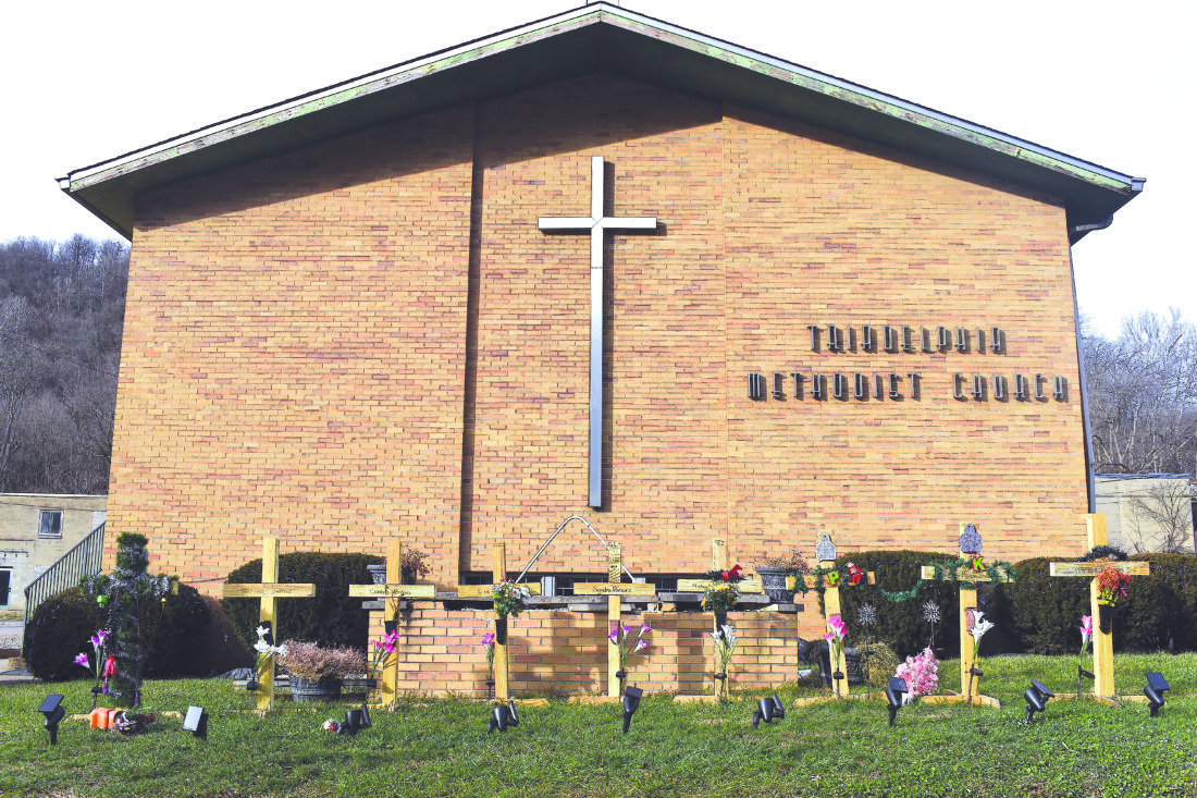 Photo by Eric Ayres Wooden crosses outside the Triadelphia United Methodist Church – each representing a victim of the deadly June 14 flood that ravaged the community – remain in place six months later, with some decorated for the holiday.