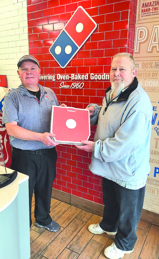 Hal Delong, left, manager of Elm Grove Domino’s poses with Kelly Robinson of Belmont, winner of The Times Leader Pizza for a year contest sponsored by the local Domino’s locations.