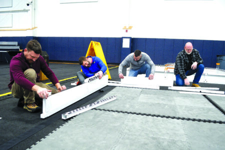 Photo by Derek Redd From left, Pat Riddle, Scot Kangisser, Seth Bell and James Laurine help set up practice areas for this week’s Gateway to the West robotics tournament at The Highlands Sports Complex.