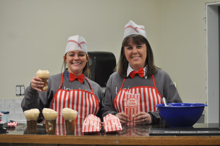 Katelin Francis, left, and Jennifer Merryman of Uniglobe Ohio Valley Travel serve popcorn and root beer floats to community members who stopped by the agency’s new location at 2258 Main to preview a centennial tour of Route 66 on Wednesday. (Photo by Stephanie Elverd)