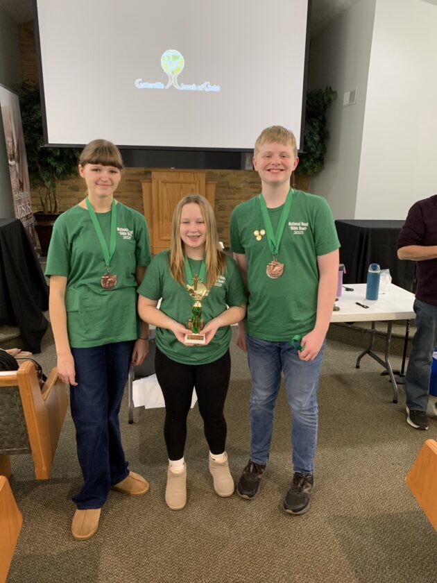 Youth members of the National Road Church of Christ, from left, Julia Cronin, Lydia Cole, Micah Parsons participate in last year’s Miami Valley Bible Bowl in Centerville, Ohio. This year’s event is being hosted at the National Road Church of Christ in Wheeling this weekend. (Photo provided)