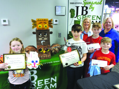 Photo by Warren Scott More than 70 area students applied imagination and ingenuity to creating works of art from things that might normally be thrown in the trash for the JB Green Team’s annual Trashy Art Contest. Participants in the event, held this weekend at 7 Ranges Entertainment, included from left, front, Irelyn Neilly of Pugliese West Elementary School, who received honorable mention for grades K-4; Gunnar Peckens of John Gregg Elementary School, who placed first for grades 5-8; and Carter Petrella and Paxton Ware, who were among five students who won gift cards through a random drawing in which all participants were entered; and back: Anita Petrella, executive director of the JB Green Team; and Louise Holliday, Jefferson County environmental educator for the JB Green Team. On the table is the entry by Milana Busby of Toronto High School that was named the JG Green Team staff’s favorite.