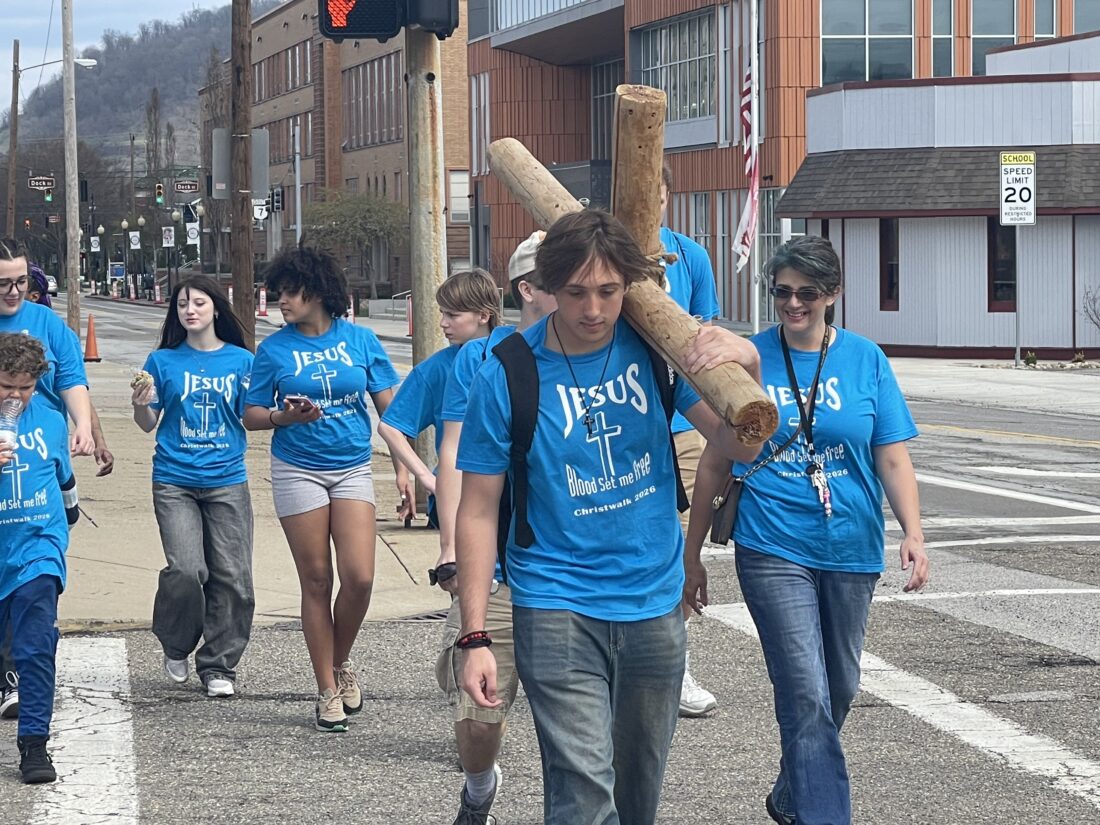 Around 100 participants in this year’s Christ Walk, which has been held on Good Friday for almost two decades, made the seven-mile trip from the Sycamore Youth Center at the corner of North and Fourth streets in downtown Steubenville to Crossroads Christian Church on Springdale Avenue in Wintersville, taking turns carrying a wooden cross.