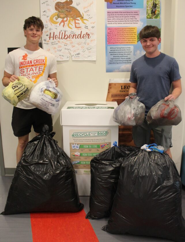 Photo provided Indian Creek High School natural resources students Hunter Rusnak, pictured at left, and Evan McGrew are spearheading this year’s Bags to Benches program through the FFA organization. The goal is to collect 250 pounds of plastic bags for recycling every three months and the school is entered into a raffle to receive a bench made from the repurposed materials. Receptacles are located at each district school and community members may donate to support the cause and help the environment.