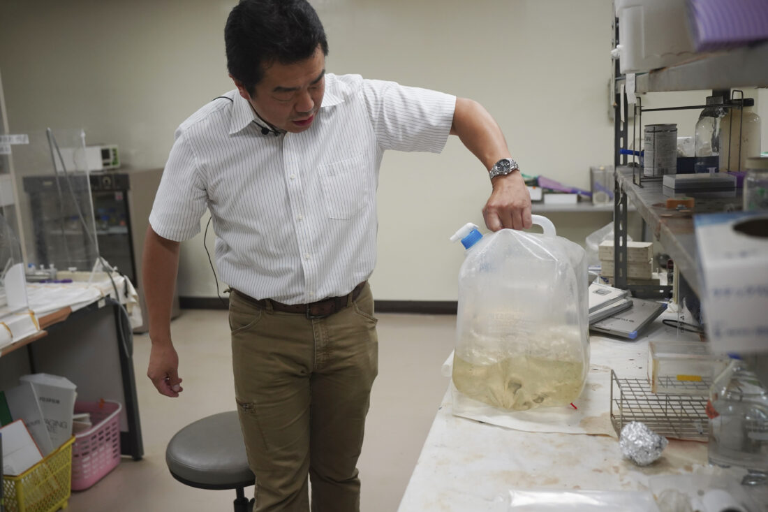 University of Tokyo environmental chemistry professor Katsumi Shozugawa shows the groundwater he collected from a no-go zone just outside of the Fukushima Daiichi nuclear plant complex earlier this year, on Wednesday, July 19, 2023, in Tokyo. Shozugawa said radioactivity of the treated water is so low that once it hits the ocean it will quickly disperse and become almost undetectable, which makes pre-release sampling of the water important for data analysis. (AP Photo/Eugene Hoshiko)