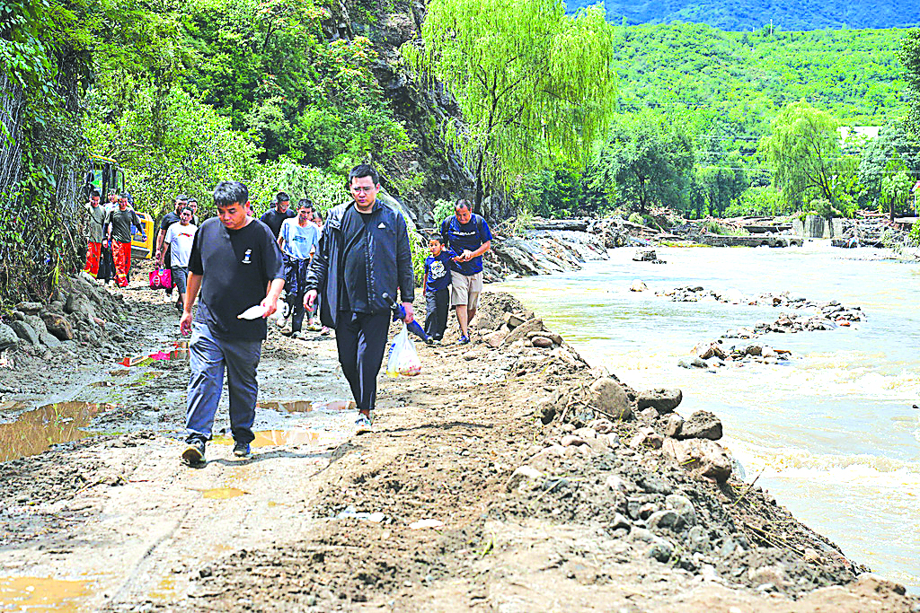 People walk on a road heading to Langjiayu village damaged by flood as they evacuate from the village after heavy rains in Miyun district on the outskirts of Beijing, Tuesday, July 29, 2025. (AP Photo/Andy Wong)