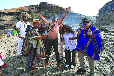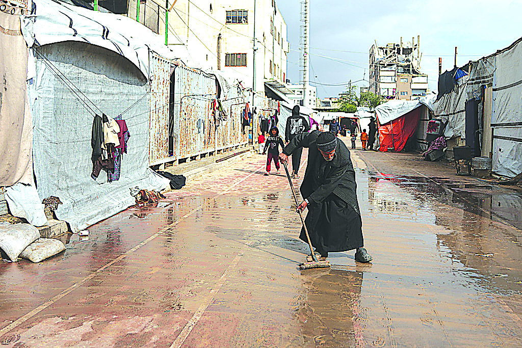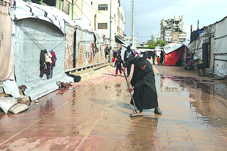 A man sweeps a street next to a makeshift camp for displaced Palestinians in Gaza City, Monday, Dec. 29, 2025. (AP Photo/Jehad Alshrafi)