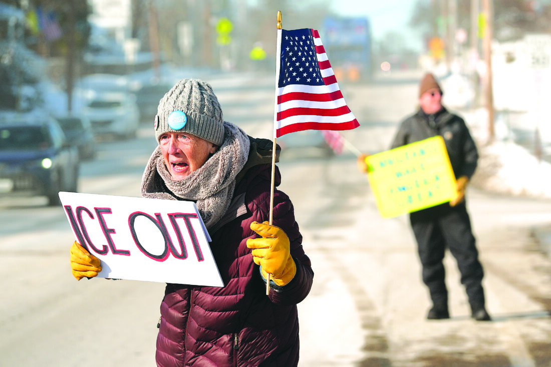 Rosie Grutze protests the presence of the U.S. Immigration and Customs Enforcement, Wednesday, Jan. 21, 2026, in Portland, Maine. (AP Photo/Robert F. Bukaty)